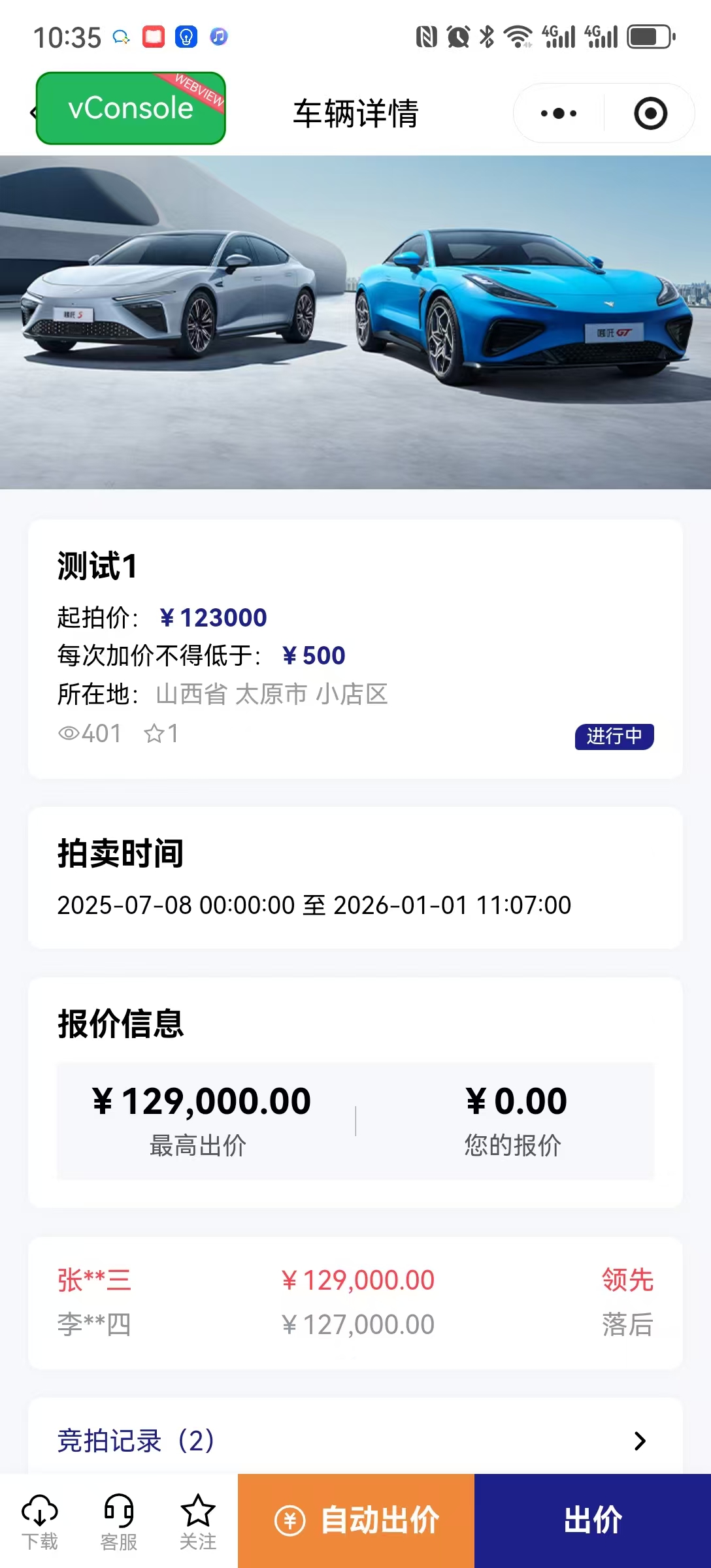 易车车辆拍卖小程序——手机一键直达、比车更比价的极速拍场 万台上新:每日10:00、16:00、20:00三场刷新,涵盖二手、事故、司法、退役出租车等全品类车源。 全景看车:720°外观+关键部位细节图+第三方检测报告,先查后拍,事故点、划痕自动标注。 闪电出价:小程序内滑动即出价,支持代理加价、秒杀倒计时、一键跟价,3秒完成操作。 安全交易:微信支付冻结保证金,未中拍秒解冻;中拍后自动生成《成交确认书》,线上即可预约过户、金融分期、物流提车。 进度管家:拍卖、过户、提车、物流、保险五大节点实时提醒,流程透明可查。 易车车辆拍卖小程